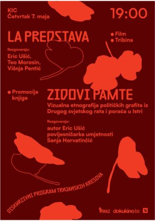 U četvrtak 7. svibnja u 19 sati očekuje nas program u sklopu Trnjanskih kresova, uz projekciju filma La Predstava Tea Morosina i Erica Ušića te promociju knjige Zidovi pamte: Vizualna etnografija političkih grafita iz Drugog svjetskog rata i poraća u Istri Erica Ušića. Uslijedit će i prigodni razgovori s redateljima filma La Predstava, uz moderiranje filmske kritičarke Višnje Pentić, odnosno s autorom knjige Ušićem i povjesničarkom umjetnosti Sanjom Horvatinčić.